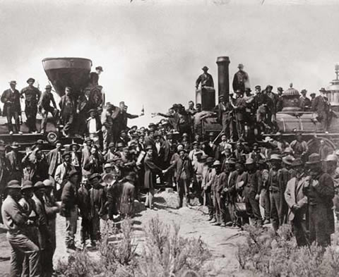 Occasionnant de gigantesques travaux jusqu’en 1869, la construction de la première ligne transcontinentale des États-Unis intervient dans une période où le capitalisme triomphe dans tous les secteurs économiques américains, et pas seulement celui du transport ferroviaire. Le train américain devient alors symbole de la rapidité du monde moderne, et même symbole de la civilisation occidentale : il entre dans la légende, devenant un mythe bien au-delà des frontières de l’Union. Ce moment fort de l’histoire des États-Unis est qualifié ironiquement de Gilded Age (âge doré) par le célèbre écrivain Mark Twain dans un livre, L’Âge d’or, un conte moderne, écrit à quatre mains avec Charles Dudley Warner au début des années 1870. En effet, les quelques décennies qui séparent la guerre de Sécession des premières années du XXe siècle constituent une période de modernisation de l’État sans précédent aux États-Unis, mais également le moment où le recours à une main-d’oeuvre mal payée et surexploitée est devenu une norme, et ou les inégalités se sont considérablement creusées entre les différentes catégories de la population américaine.