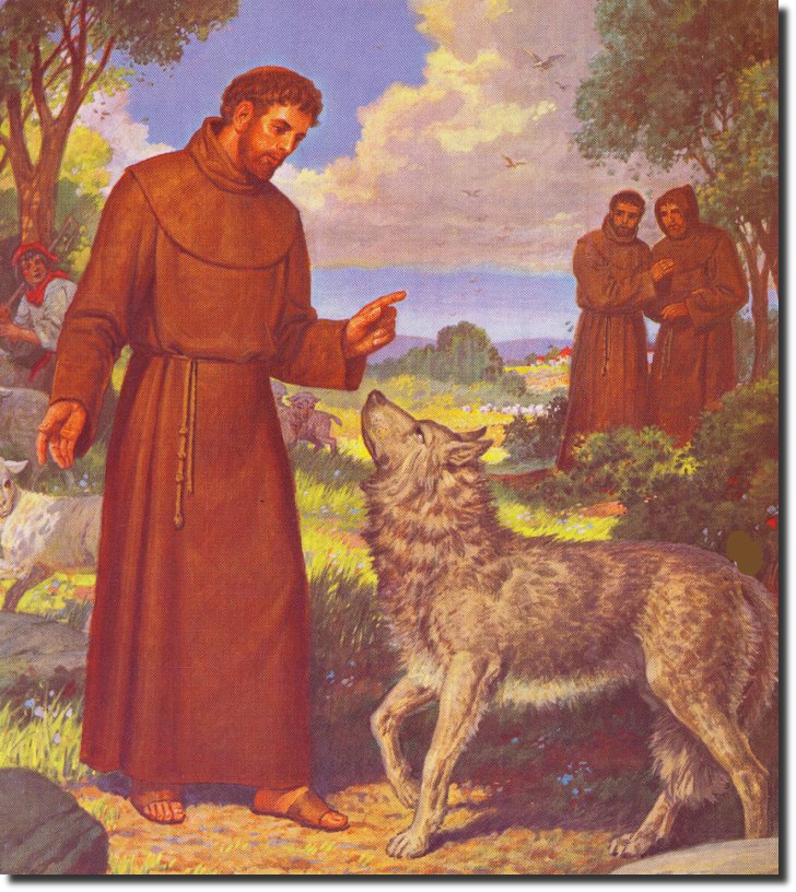 Alors que saint François séjournait dans la ville de Gubbio, il apprit qu’un loup féroce rôdait autour, s’attaquait aux animaux des fermes mais aussi aux humains. Les habitants étaient terrifiés par l’animal. Saint François partit alors à la rencontre de cette bête. S’approchant d’elle, celle-ci courut pour l’attaquer, mais saint François faisant un signe de croix, calma la bête au nom de Dieu : « Viens ici, frère loup, je t’ordonne au nom de Jésus Christ de ne faire aucun mal, ni à moi ni à personne. » S’apercevant que l’animal était affamé, saint François lui promit qu’il n’aurait plus jamais faim s’il arrêtait d’attaquer n’importe quoi et n’importe qui. Le loup acquiesça et promit d’un geste en lui tendant la patte.