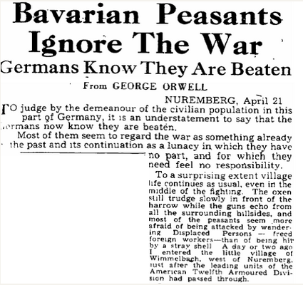 « Lorsqu’on lit les reportages d’Orwell sur la France, on est frappé par l’excellente connaissance qu’il avait du contexte politique français, et des enjeux qui se posent au pays à la Libération, ainsi que sa capacité à expliquer une situation complexe à ses compatriotes. […] Il s’avère être un excellent reporter. Il sait raconter, mais aussi distancier et contextualiser, comme dans cet étonnant article Les paysans bavarois ne connaissent pas la guerre où il décrit d’abord un paysage rural et tranquille […] avant d’enchaîner : « une question se pose encore et encore. Dans quelle mesure ces paysans, de toute évidence simples et doux, qui se rassemblent à l’église le dimanche matin habillés sobrement de noir, sont-ils responsables des horreurs des Nazis ? » »