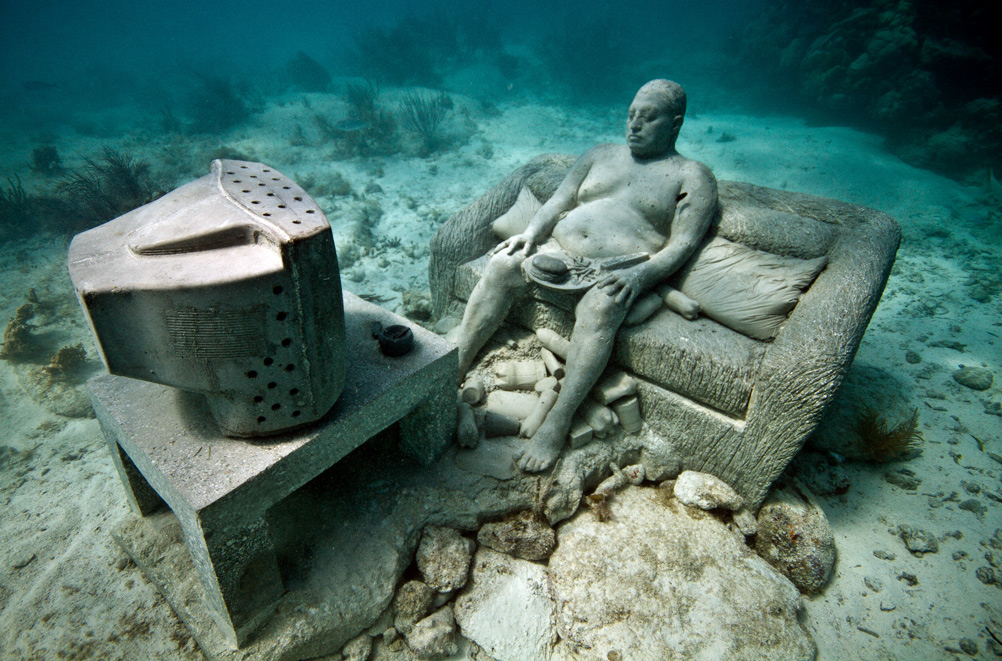 Depuis les banquiers faisant l’autruche, tête dans le sable, à l’obèse nu avachi sur son canapé et devant sa télévision, l’univers sculptural de Jason deCaires Taylor est riche de références – tantôt tendres, tantôt ironiques – au quotidien du monde humain. Dans un contexte naturel, voire « public » (quoique sous-marin), ses créations s’inscrivent dans la tradition du land art tout en rompant avec le cube blanc de la galerie (et, par extension, du musée ou de la foire artistique) devenu le lieu d’exposition artistique obligé de l’époque contemporaine.