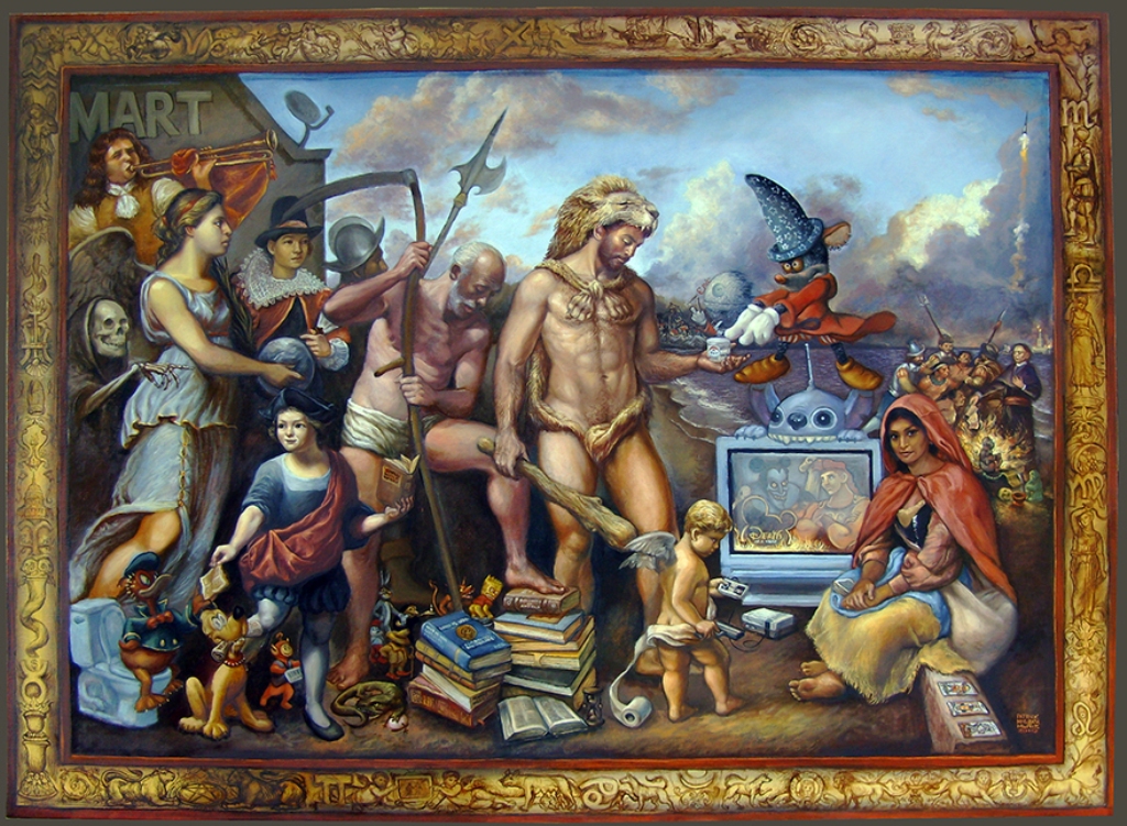 La figure centrale est une représentation du héros classique Hercule, issu de la littérature gréco-romaine. Tandis que la souris magicienne s’élève au-dessus d’un écran de télévision en faisant un geste de commandement, notre héros tient un pot de cire dépilatoire dans sa main gauche. Dans cette œuvre inspirée du « Triomphe du Temps » de Brueghel, gravé en 1574, j’ai créé une composition qui l’évoque à travers une procession d’atouts. Comme dans le tarot et plusieurs célébrations païennes et chrétiennes, chaque personnage est suivi par un autre d’un rang plus élevé. Derrière le héros, j’ai peint des figures allégoriques qui représentent le Temps, la Conquête, l’Enfance, la Terre promise, la Célébrité et la Mort. Ces figures allégoriques sont accompagnées par de petits personnages à la Disney et d’autres icônes liées à la culture de la consommation. Le groupe est sur le point de rencontrer un gitan diseur de bonne aventure assis sur un banc avec trois cartes de tarot exposées. Les cartes du fou, du pendu et de la mort représentent une partie essentielle du voyage du héros, qui le mène du début de sa quête au sacrifice puis à la mort. À l’arrière-plan, d’autres histoires parallèles se déroulent. On trouve Diego de Landa, un archevêque espagnol du XVIIIe siècle qui a brûlé d’innombrables textes sacrés mayas, effaçant l’histoire précolombienne au nom de la chrétienté. Lorsqu’ils sont placés dans une même peinture, les récits se relient, créant un nouveau sens. Les autodafés et la destruction de livres ayant eu lieu dans le passé ne semblent pas si éloignés de l’activité des entrepreneurs évangélistes d’aujourd’hui, dont la cible est le consommateur. Le cadre peint, qui borde la composition, représente les signes astrologiques et symboles contemporains qui renvoient aux idées de la Renaissance sur le temps, tout en interrogeant la nature cyclique de l’histoire. Je vois cette peinture comme une métaphore de la manière dont les individus, l’histoire et les cultures du monde sont conditionnés et « disneyifiés » de façon à s’accorder à la société massifiée et mondialisée du temps présent. Lorsque deux cultures ou deux aspects de la culture se rencontrent, il semble exister une inévitable relation colonisateur/colonisé qui, en retour, affecte notre propre appréciation et notre compréhension d’une culture.