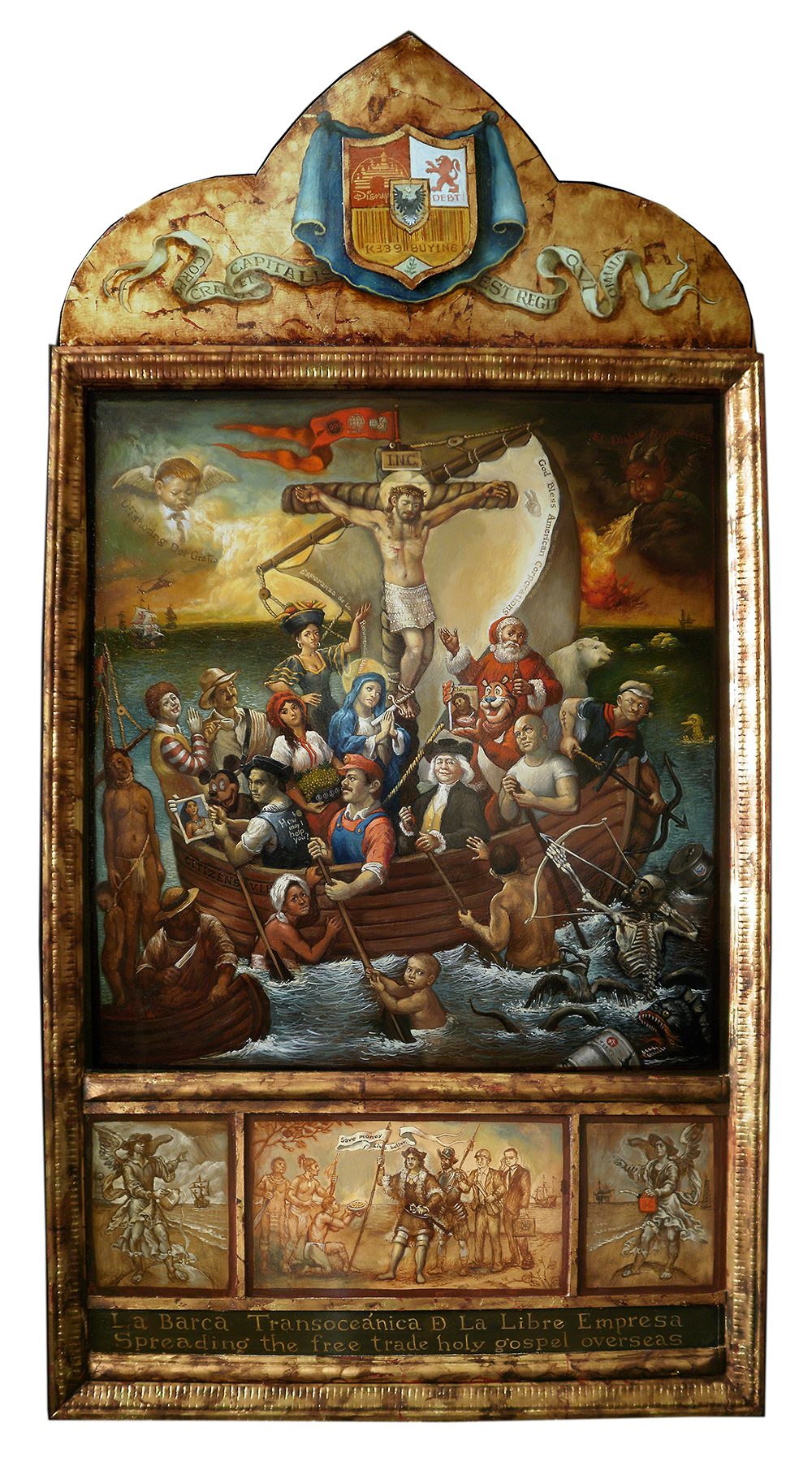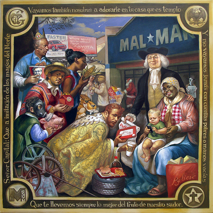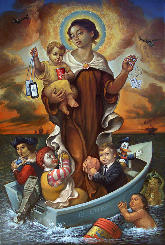 Vous utilisez les formes de l’art sacré pour parler de notre époque et votre art mêle constamment les références au capitalisme avancé (personnages et logos des marques, gadgets technologiques, malbouffe) et celles à la mythologie chrétienne. Une exposition, en 2012, s’intitulait même « Saints, Héros et Transnationales » (Saints, Heroes and Corporations). En quoi estimez-vous que le capitalisme est un religieux nouveau ? Quelles œuvres abordent-elles ce thème et comment ?