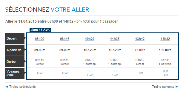SNCF, mon Amour. Prix d’un billet Brest-Paris le jour du début des vacances de printemps en zone A (durée moyenne du trajet de 4H40, parce que le train ne roule pas à grande vitesse sur tout le trajet). Tu la sens poindre, l’arnaque ?
