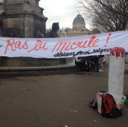 Dès lors, il fallait agir, et vite. Et quoi de mieux, pour ce faire, que d’envoyer des culottes tâchées de rouge à nos amis les députés ? Homo festivus, ou plutôt Femina festiva, s’en est donné à cœur joie, jusqu’à organiser un “rassemblement festif” le 11 novembre (où on commémorait un autre sang versé, mais c’est une autre histoire), à 15 h, place du Châtelet à Paris. Le collectif Georgette Sand, à l’origine de l’événement, promettait des “animations visuelles créatives”. Et on a été servi…