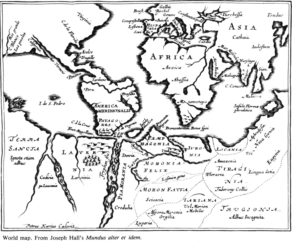 Le préfixe dys de dystopie renvoie au grec dun qui est l’antithèse de la deuxième acception étymologique d’utopie (non pas u mais eu, “lieu du bien”). On fait remonter l’origine du mot “dystopie” tantôt au livre du philosophe tchèque Comenius intitulé Le labyrinthe du monde et le paradis du cœur (1623-1631), tantôt au livre Mundus Alter et Idem (Another world and yet the same, 1605) de l’évêque Joseph Hall, considéré comme l’inventeur de la subdivision du genre littéraire de l’utopie : la satire dystopique. Hall tourne en ridicule les récits de voyages populaires et s’emploie à fustiger les vices, notamment en inventant une carte de pays imaginaires dont chacun est régi par un vice dominant : par exemple, la Pamphagonia est le pays de la gloutonnerie, ou l’Yvronia, la région de l’ébriété.
