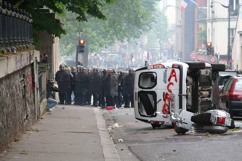 Sinon, on fait quoi pendant une émeute ? Bah, ça dépend. Parfois, on essaie vaguement de tenir une place face à des CRS suréquipés en leur balançant des trucs, mais ça leur fait pas grand chose, on prend plus cher qu’eux. Parfois, on les balade en manifs sauvages, en balançant des poubelles et des barrières derrières nous pour essayer de les retarder.