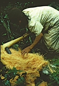 Les haches utilisées par les Guayaki étaient faites d’un manche de bois prolongé par un galet de diorite, une roche magmatique. Comme il en va de toutes choses chez les Guayaki, la nature n’était pas mise à la disposition des techniques humaines, mais venait trouver sa place naturellement dans la vie des hommes, ainsi, le galet était sélectionné parmi ceux que le courant avait su polir avec le temps et les hommes le plaçaient dans une branche volontairement fissurée, jusqu’à ce que l’arbre, cicatrisant, encastre ce dernier vigoureusement. La hache était finalement cueillie, comme l’était la majorité de la nourriture de ces tribus. Il fallait voir l’un d’eux décrocher de la plaie d’un arbre une hache dans un geste souple, recueillant avec reconnaissance ce don, c’était d’une beauté à nulle pareille.