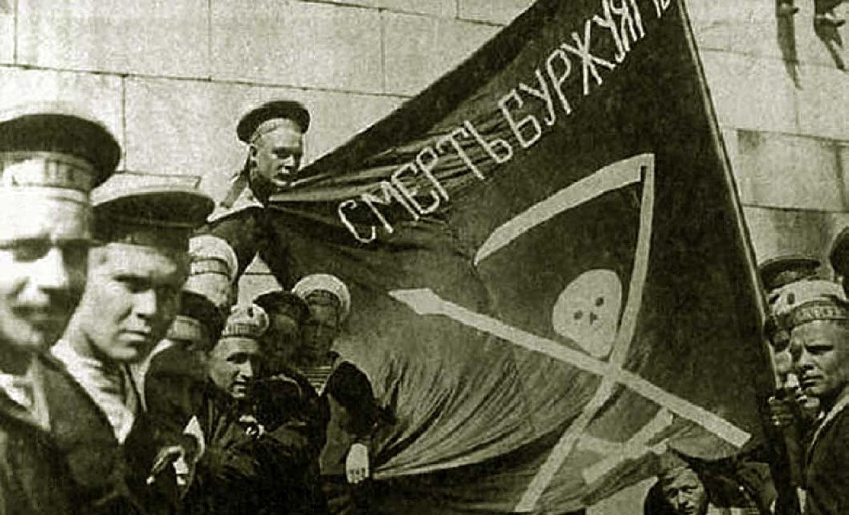 Marins de Kronstadt sur le cuirassé Petropavlovsk – le slogan « Mort aux bourgeois » est inscrit sur le drapeau, été 1917.