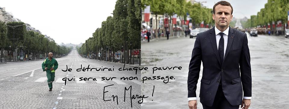 Depuis son élection, et après être parvenu à propager la gangrène LREM au sein de l’Assemblée nationale, Emmanuel Macron met toute son énergie à tuer l’ensemble des lois et principes qui garantissaient la cohésion et l’équilibre des forces sociales en France. En moins d’un an, le bilan dont ses troupes s’enorgueillissent est celui-ci : baisse des aides sociales, coupes budgétaires, baisse des salaires et plan de “départ volontaire” dans le secteur public, explosion du Code du travail, dynamitage de la solidarité nationale par la baisse ou la suppression de certains impôts, licenciements à tire-larigot dans des entreprises pourtant bénéficiaires, ce à quoi on peut ajouter le renoncement systématique sur quasiment tous les dossiers écologiques, le suicide et la dépression de nombreux travailleurs usés jusqu’à la corde et la persécution d’État envers les réfugiés.