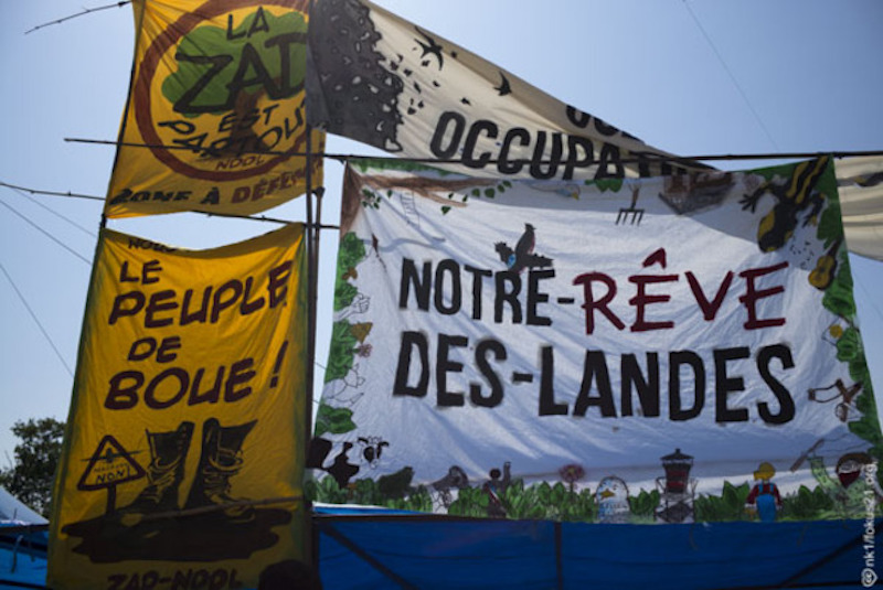 « Moi, j’avais choisi de venir vivre ici parce que cette lutte me semblait être un bon endroit d’où tenter des trucs différemment, pour mettre des bâtons dans les roues de ce monde de merde là où il ne s’y attend pas. Pour moi, c’était une tentative d’esquiver l’écologie, trop facilement récupérable, parce que c’était juste un aéroport parmi des centaines et pas une de ces fameuses centrales nucléaires avec ses écolos qui proposent des parcs éoliens à la place. C’était aussi une manière de zapper le mythe de “mère nature” à cause du paysage de bocage par définition totalement maîtrisé et fonctionnel. Et de tenir à distance le “retour à la terre” des “bobos” parce que la ZAD est face à un plan d’expansion urbaine massive avec peu de place pour des rêves de potagers à l’eau de source, petits bébés jolis jolis et tout-le-monde-a-qu-à-faire-comme-nous. Tout ça en se connectant à d’autres réalités de ce que la ville d’à côté concentre et produit comme rapports d’exploitation, de contrôle, de manipulation “démocratique et citoyenne”, de mépris, d’uniformisation, de répression et de ségrégation. » (un ancien occupant de la ZAD, dans un article intitulé « Le “mouvement” est mort. Vive… la réforme ! »).