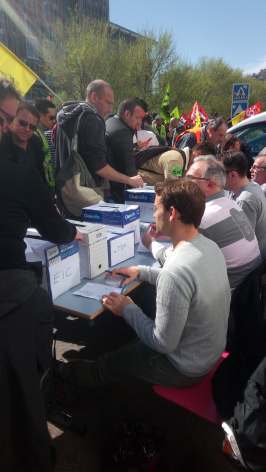La dernière intervention est celle d’un usager. Il propose de créer un collectif d’usagers, qui pourrait aider à la distribution de tracts ou à d’autres tâches ingrates mais d’une impérieuse nécessité. Les cheminots opinent du chef, une fois de plus. Le micro, enfin, est lâché. Les délégués syndicaux appellent à voter pour la suite du mouvement, et tout le monde se dirige vers les boîtes en carton prévues à cet effet. Je note d’ailleurs que lors de ce vote, chacun vote dans une boîte séparée, selon son affiliation professionnelle : TER, EIC… Ce qu’une personne ne manque pas de souligner : « Il s’agit de créer des moyens d’assembler un mouvement hétérogène et le chemin emprunté lors des votes semble ne pas s’y engager. Il faut qu’on en parle entre nous, le système du vote doit impérativement être repensé. Les syndicats sont nécessaires, puisqu’ils disposent d’outils pensés en vue de ce type de bataille, mais il faut que le mouvement dispose d’une réelle autonomie et surtout, qu’il dépasse le cadre strict desdits syndicats. »