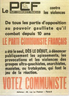 Il est aussi nécessaire de rappeler le retour de bâton dans le pays légal dans l’immédiat après mai, avec notamment l’élection de la chambre « bleu horizon » – introuvable pourrait-on dire – aux législatives de juin 1968. La majorité de la population a eu très peur et les premiers effets de l’abstention de gauche ont sans doute commencé à se faire sentir – le fameux « élections pièges à cons » – d’où ce raz de marée droitier dans les urnes.