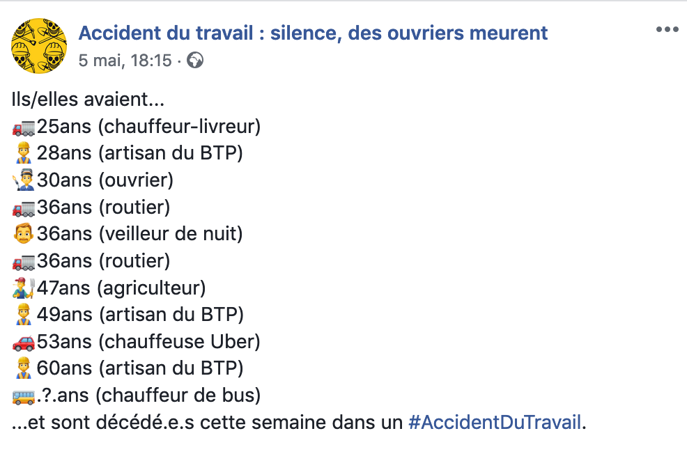 - La page Facebook Silence, des ouvriers meurent ! tient une veille régulière sur les accidents de travail