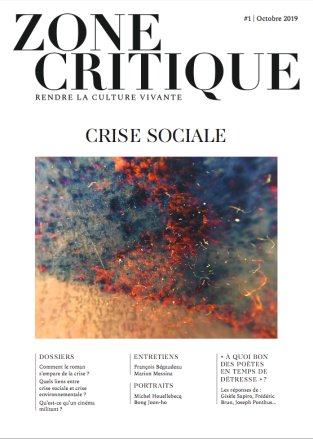 Après sept années d’existence en ligne, la revue Zone Critique sort son premier numéro papier dont le thème principal – et très actuel – est la crise sociale. Servie dans un écrin du plus bel effet (la mise en page, la typographie, les illustrations : tout est d’une grande finesse), la revue accorde une large place à la réflexion littéraire mais aussi à l’analyse cinématographique avec notamment des portraits de Bong Joon-ho et sa « révolte biologique » des prolétaires, Ken Loach et sa dénonciation du libéralisme économique, Lee Chang-Dong et son « thriller poétique » Burning. Mais l’on parcourt aussi la rugosité des paysages dans le cinéma de Bruno Dumont et des frères Dardennes, la sublimation du réel chez Godard ou les apories du capitalisme dans la saga Alien.