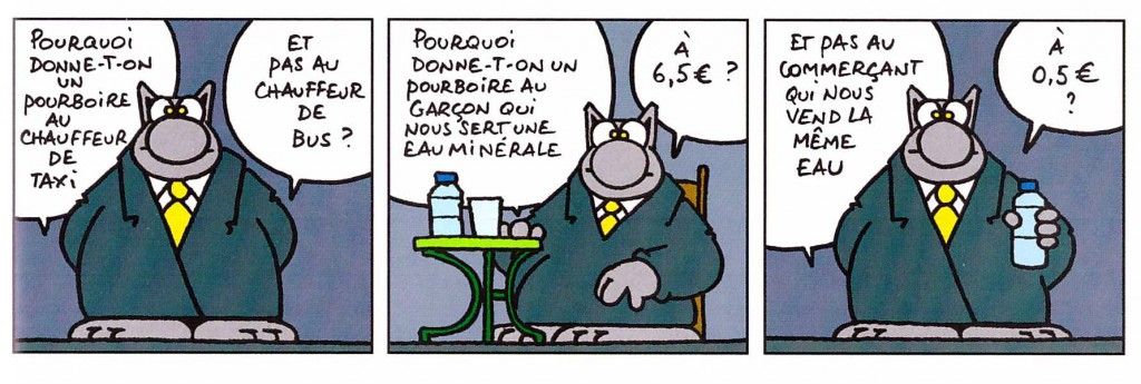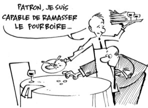 Aux États-Unis, les pourboires peuvent représenter facilement la moitié du salaire des serveurs. Ce surplus par rapport au prix à la carte est en vérité autant de salaire en moins supporté par le patron, lui permettant de garantir sa marge en payant le moins possible son salarié. Morale de l’histoire : plus on est riche, mieux on est servi, plus on est beau, plus on a de chance d’obtenir de gros pourboires. D’un point de vue global, l’argent liquide des tips est autant de revenu mal distribué dans le circuit économique. Il échappe à la solidarité nationale alors qu’en incluant le service dans le prix à la carte, donc en augmentant les salaires, la contribution sociale du pourboire serait supérieure.
