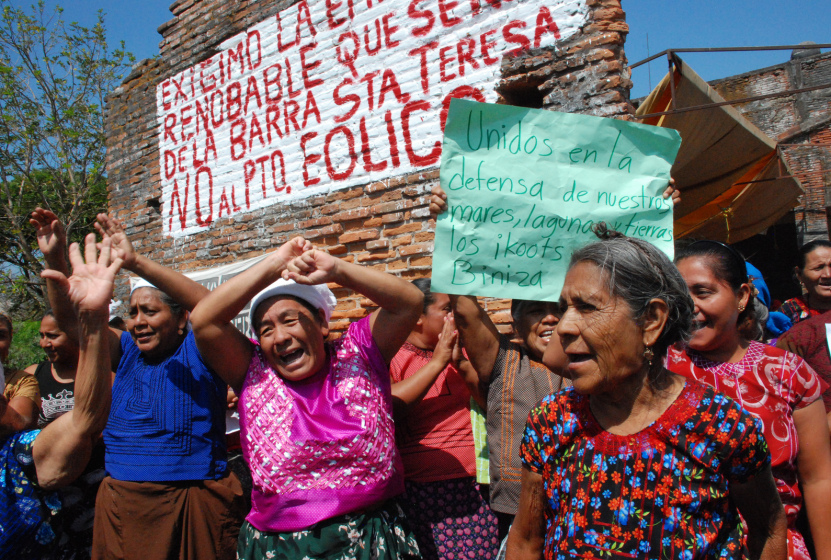 La résistance aux parcs éoliens, surtout organisée par les indigènes zapotèques et les fermiers et pêcheurs ikotz, existe depuis le début de la construction, mais elle a gagné en importance après que les locaux se soient rendus compte des effets des premiers parcs éoliens. Dans la partie sud de l’isthme, la majorité des gens sont opposés aux parcs éoliens et ils sont engagés dans la lutte. La plus importante et la plus grande victoire pour le mouvement de résistance a été l’annulation d’un important parc éolien en 2015, qui était prévu pour être l’un des plus grands parcs éoliens d’Amérique latine, après des années de lutte au cours desquelles les activistes ont été harcelés, injuriés, mis en prison et même tués. La lutte pour arrêter l’extension des parcs éoliens a réuni plusieurs communautés (y compris beaucoup de femmes qui ont joué un rôle majeur) et a atteint son summum lorsqu’une barricade et une occupation ont été mises en place pour empêcher l’accès au site de construction.