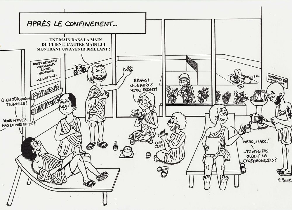 Et enfin, la cathédrale suprême du tertiaire, le Duomo, le gigantissime labyrinthe de Minos, celui qui comprime le mieux les artères et les veines du travailleur, oppressant l’estomac et garrottant l’énergie : le simulacre des bureaux ; le décor monté bien souvent à la va vite, permettant de transformer l’outil de travail en image du travail : tables, ordinateurs, téléphones, classeurs, dossiers, sacro-saints parapheurs, mythiques notes de service. Attention, le labyrinthe ne s’arrête pas ici, il croît indéfiniment et l’enchevêtrement de ses ruelles, les nombreuses voies de garage auxquelles il conduit, pénètrent la société tout entière. Cet urbanisme délirant se superpose à la société ontologique, il la dévitalise. Ainsi, rien n’empêchera Antoine de travailler, de consulter ses mails, d’en envoyer, de parachever ses dossiers, de téléphoner à tel ou tel collaborateur. Certes, durant cette période, il ne pourra pas rencontrer les gens et cela aura sans doute un impact, car l’humain a besoin de contact physique mais, dans l’ensemble, étant donné son travail de service, il n’a pas besoin, d’être confiné, pardon, assigné dans un bureau. Il n’a pas besoin non plus de commencer à 8h15 et de finir à 17h45. Les réunions hebdomadaires de service ne sont pas nécessaires non plus.