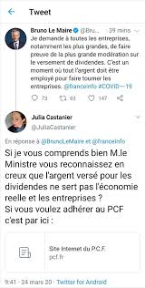 Mais surtout où est la générosité de ceux qui possèdent le capital ? Les soit-disant « créateur de richesse 6 » du système qui pillent la richesse nationale en s’engrossant de dividendes en hausse de 12 % cette année ? Même Bruno Le Maire dans un tweet appelle à une distribution « raisonnable » des dividendes pour favoriser l’économie réelle. Quel aveu de faiblesse du ministre de l’Economie alors que depuis deux décennies, les économistes hétérodoxes soulignent les conséquences malsaines de cette déconnexion entre la sphère financière, spéculative et la sphère réelle de l’économie. L’économiste Dany Lang appelle dès maintenant à ce que les dividendes soient utilisés pour recapitaliser les banques et reversés aux salariés qui assurent la création de richesse.