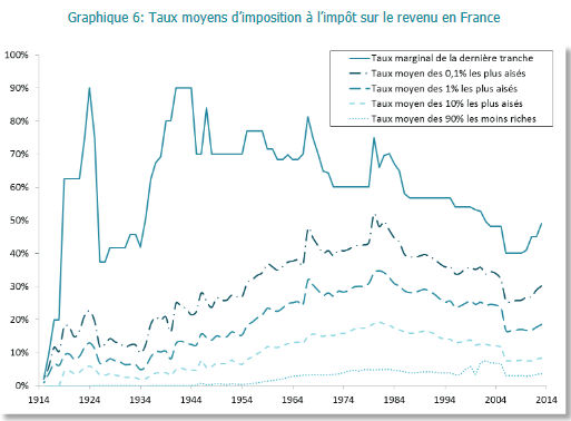 L’écart entre le taux marginal d’imposition des plus hauts revenus par rapport au reste de la population n’a cessé de baisser depuis la fin de la seconde guerre mondiale.