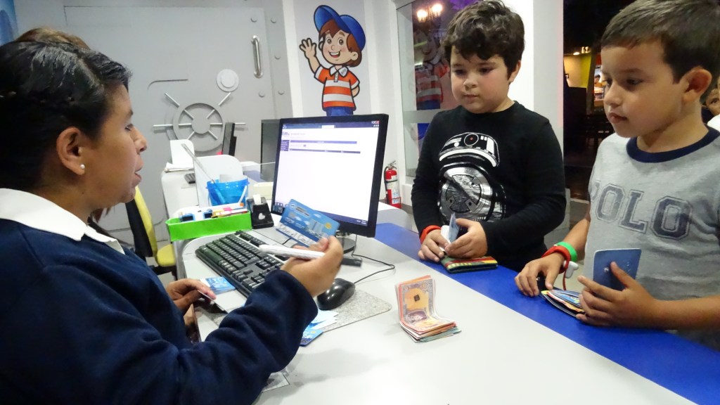 À Divercity, l’initiation au monde des adultes commence donc… à la banque. À l’entrée, l’enfant se voit remettre un chèque, qu’il doit déposer. S’il s’agit d’une première visite, un compte est ouvert et une carte de débit lui est remise. Le compte peut être débité, par retrait au guichet ou sur les bornes dans l’enceinte du parc, mais aussi crédité par les « revenus » qu’il génère en réalisant diverses activités.