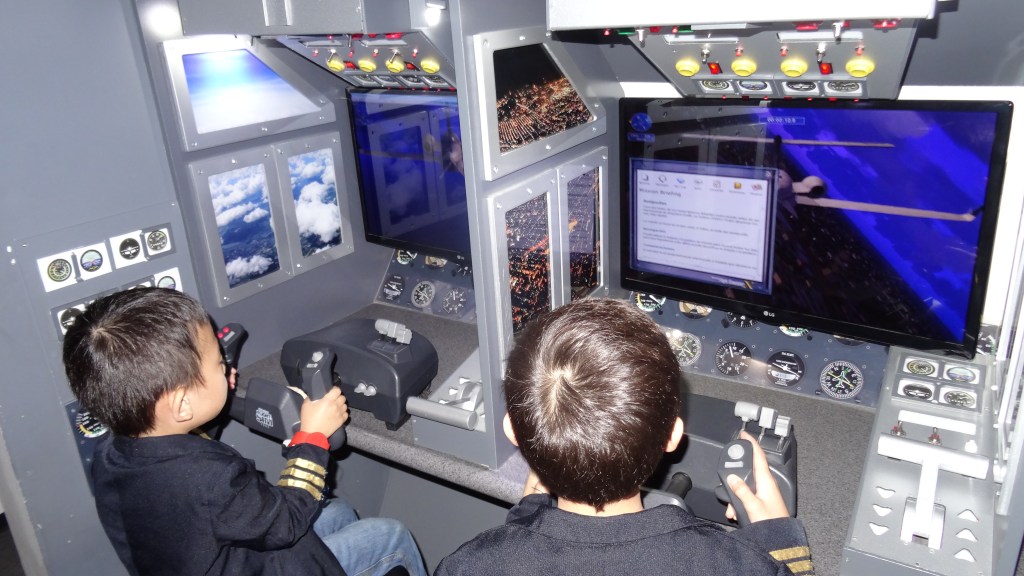 Les enfants « apprennent » à devenir pilote de l’air devant des écrans, dans une imitation de cabine d’avion.