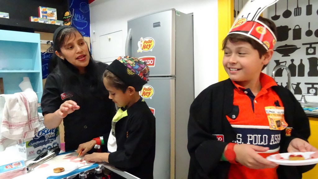 Après cet examen informel de reconnaissance des marques, sponsors de l’attraction et toutes deux propriété du groupe Multi-Inversiones, la jeune « chef » initie les enfants à la « cuisine » en les faisant passer l’un après l’autre derrière les plaques pour découper une tranche de jambon, lui ajouter du ketchup et réaliser une figure dans l’assiette en plastique. Ils y ajoutent ensuite un des nuggets qui, entre-temps, grillaient dans un fond d’huile. L’animatrice ne manque pas de rappeler, tout de même, qu’il « ne faut pas manger trop gras ».