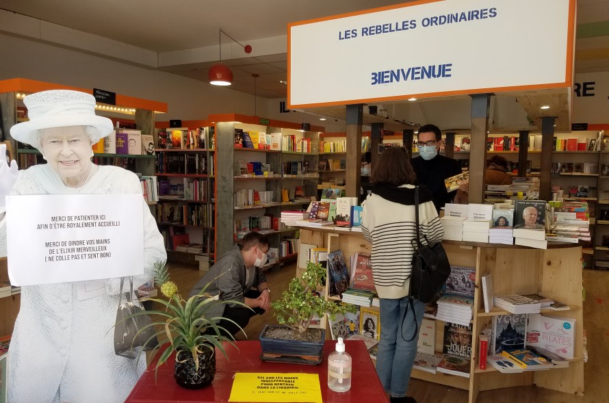 Cette crise est grave, il faut en prendre conscience. Notre objectif est simple dans la librairie : que le virus ne s’y propage pas comme une trainée de poudre — nous avons des personnes en grande fragilité qui fréquentent notre lieu — et en même temps que les mesures à respecter ne soient pas vécues comme oppressantes. Il y a une vraie pédagogie à faire vis-à-vis du public afin de faire respecter les gestes barrières avec intelligence et de façon accueillante. Nous devons vérifier si chacun a bien un masque, si untel s’est lavé les mains avant de toucher un livre. C’est parfois un peu usant car cela nous place d’entrée de jeu dans une position de gendarme, alors que ce n’est pas vraiment l’état d’esprit de la librairie dans laquelle on est très libre — on peut d’habitude lire un livre gratuitement à l’étage, le reposer — mais c’est inévitable. Une décoration humoristique à l’effigie de la reine d’Angleterre  a été mise en place afin d’expliquer le « protocole » avec humour et essayer de désamorcer les conflits.