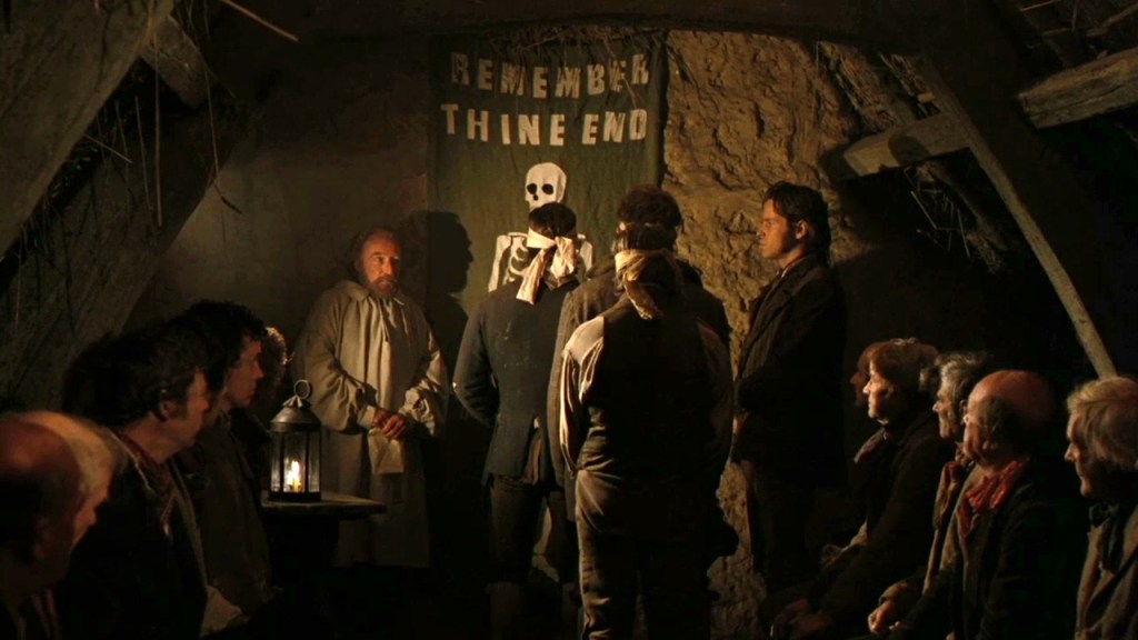 Ceux-ci pouvaient notamment compter sur le soutien de l’église anglicane qui s’efforçait, lors des prêches hebdomadaires, de prôner l’ordre naturel des choses et de mettre en garde contre les comportements “acerbes”. Méthodistes, les laborieux préféraient chanter leurs cantiques dans une chapelle à l’écart des sermons rigoristes du pasteur. Une riche fillette résumera, plus tard dans le film, les incommensurables différences entre les deux pratiques spirituelles : « Je ne comprends pas toujours ce que Jésus dit. Si mon papa disait cela en public, il serait la risée de tous. » En effet, loin de l’ascèse christique, d’une morale de la modération et du partage du pain, les dévots prospères pètent dans la soie et se bâfrent comme des porcs, laissant les gueux littéralement ronger leurs restes. À ce titre, la description des rapports de force au sein du village de Tolpuddle est très cruelle : le déséquilibre est flagrant, les ouvriers doivent accepter la baisse de leur salaire ou mourir de faim. Dans un souci d’authenticité, le réalisateur a notamment pris soin de ne pas engager de vedettes pour jouer les rôles des villageois. L’identification et l’empathie en sont décuplées.