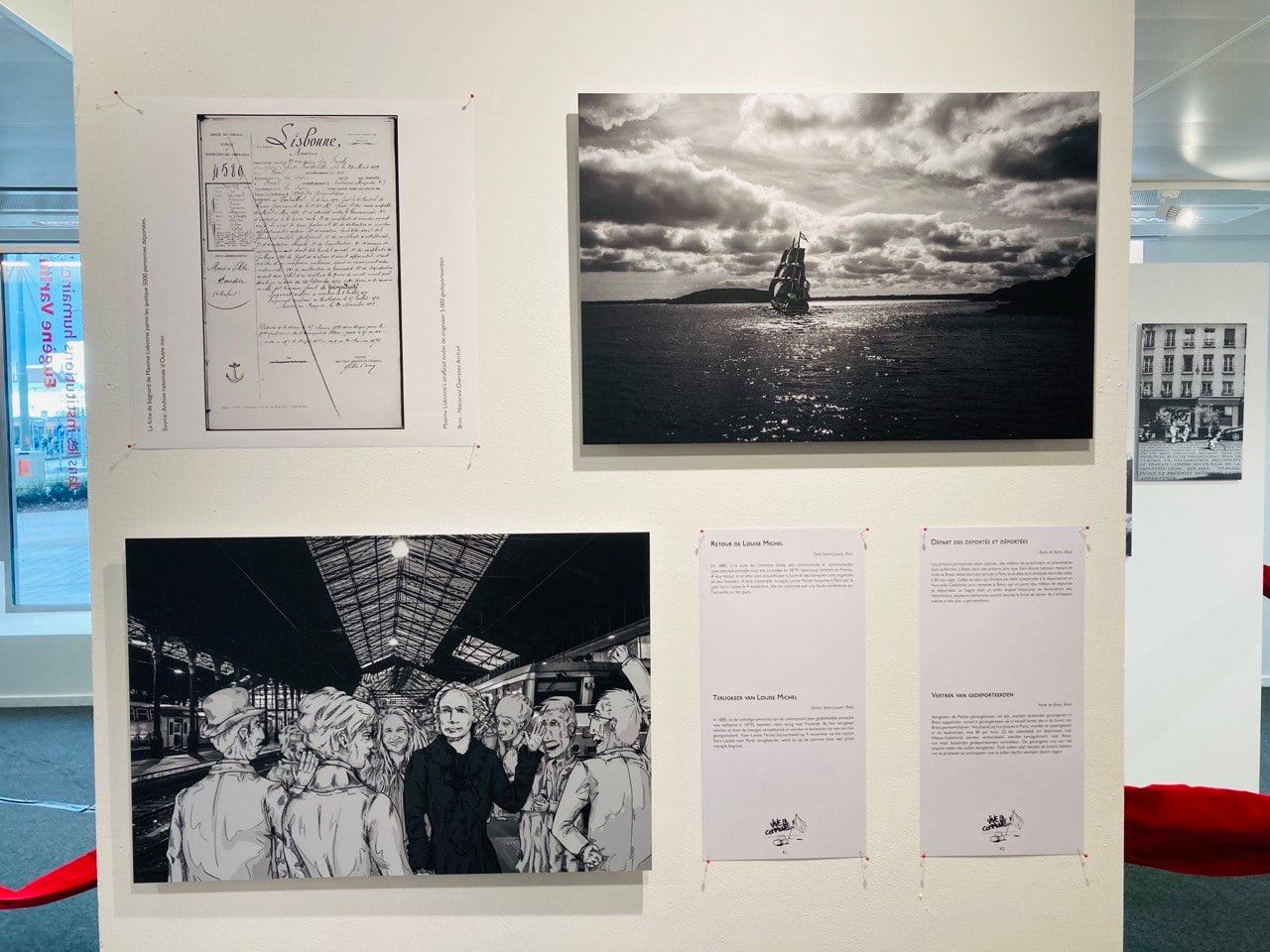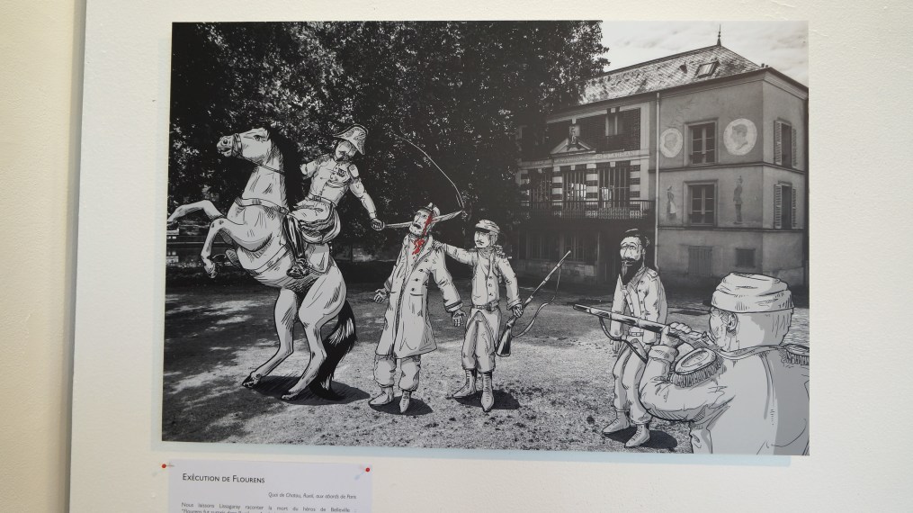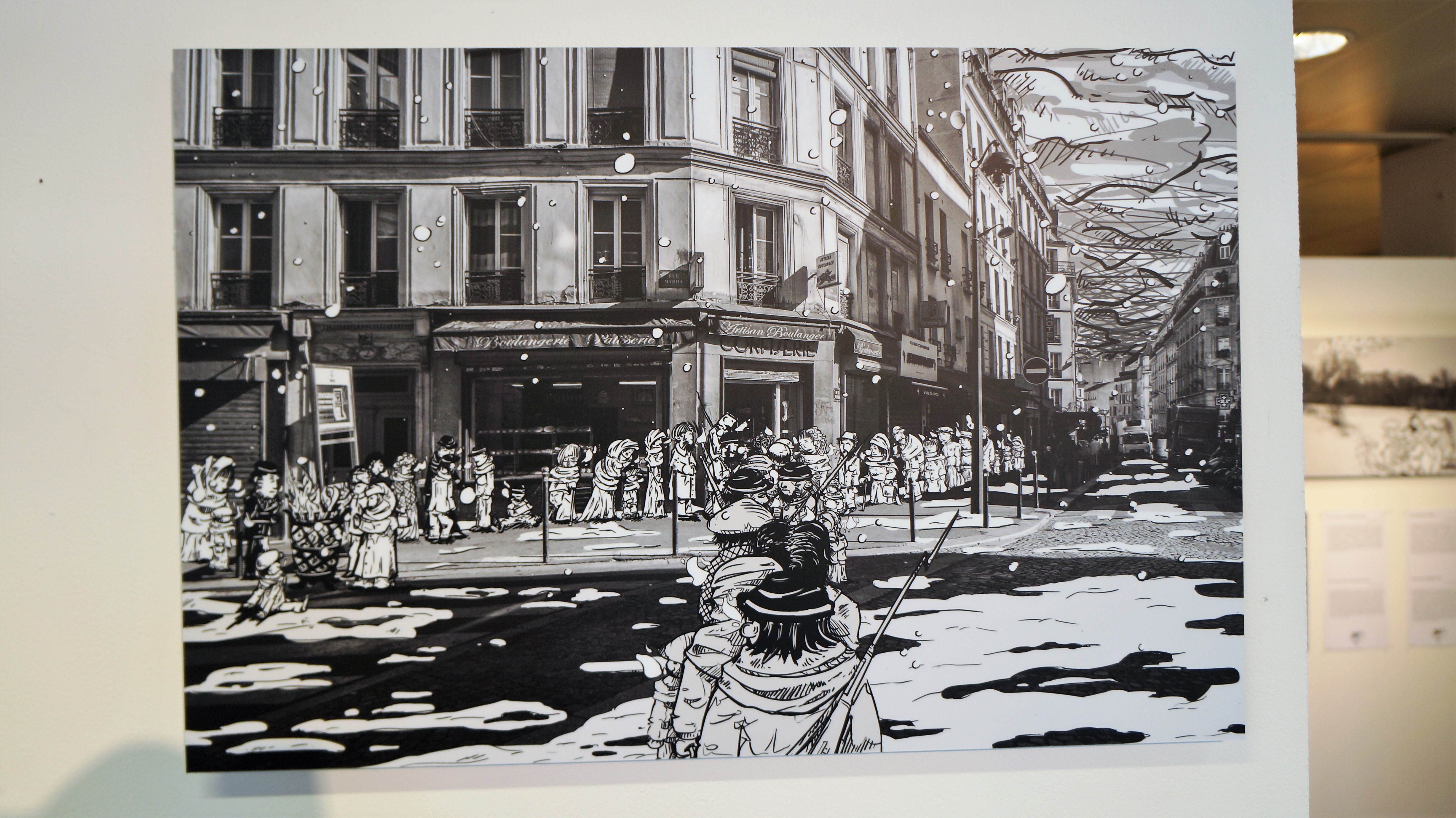 Sixtine d’Ydewalle : Nous l’avons organisée dans le double but de rendre hommage aux communards et communardes qui ont, l’espace des quelques semaines, rêvé et vécu un monde plus égalitaire et solidaire, et de faire la lumière sur ces idéaux et actions qui inspirent toujours aujourd’hui. Au départ, cette exposition fait partie d’une série dont le concept est de montrer des endroits où se sont passées des luttes importantes, en tout cas des moments importants d’une certaine lutte, avec des photos actuelles des lieux où elle s’est déroulée, sur lesquelles des dessinateurs apposent ensuite leur dessin illustrant l’événement passé – histoire de voir ce que le lieu est devenu, et parce qu’on n’a presque aucune trace de ce qui s’est passé à l’époque. C’est un concept – les « photographies dessinées » – qui vient du photographe de l’exposition Karim Brikci, qui a déjà mis ça en pratique avec Manu Scordia, un des dessinateurs de l’exposition, pour les 50 ans du parti des Black Panthers. Là on a réfléchi « c’est l’anniversaire de quoi bientôt ? », on a vu que c’était les 150 ans de la Commune, et il se trouve que je travaille dessus en parallèle pour ma thèse, de fait depuis un an et demi on s’est beaucoup renseigné dessus, on a fait les photos en juillet passé et les dessinateurs ont travaillé dessus depuis septembre.
