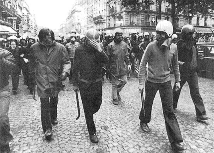 Le service d’ordre antifasciste de la Ligue Communiste en route vers la Mutualité, pour interdire un meeting des néo-fascistes d’Ordre Nouveau, le 21 juin 1973. L’altercation fut massive et très violente (71 blessés du côté des forces de l’ordre), et mena à la dissolution des deux groupes, pour sauver la face, et ce, malgré leur noyautage par les RG.