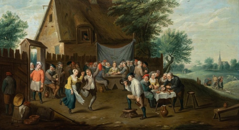 TENIERS LE JEUNE David, « Les noces paysannes », XVIIe siècle. C’est ici une scène de noces qui est représenté par le peintre. Selon une vielle coutume flamande, la mariée est installée sous une couronne de fleurs d’orangers, entouré de sa mère et sa belle-mère. La future mariée est la reine de la journée, mais n’a pas droit de parler ou de manger avant l’arrivée de son futur époux.