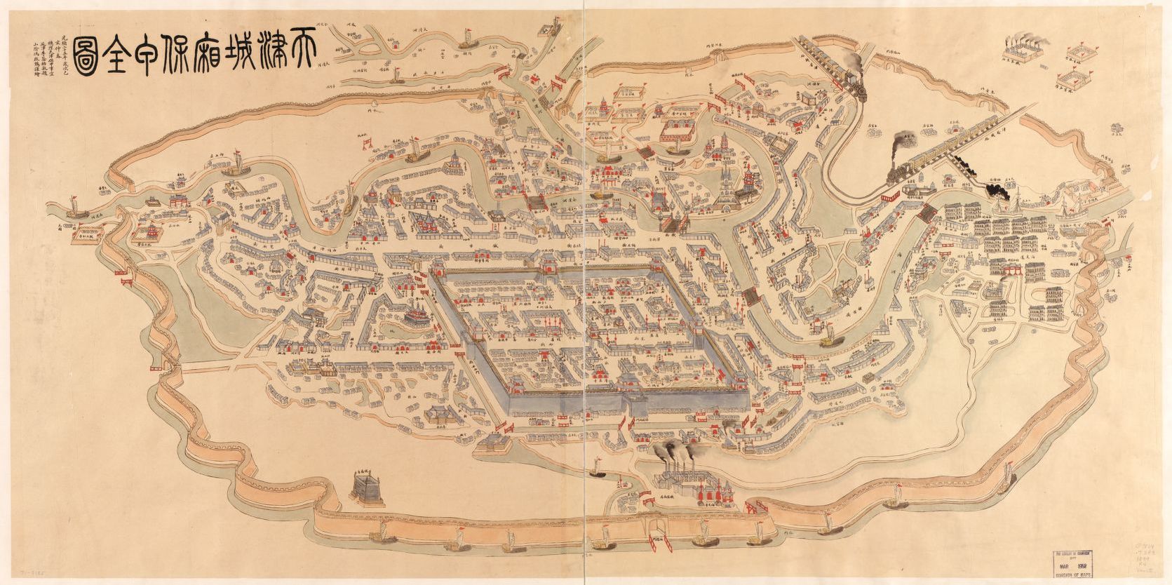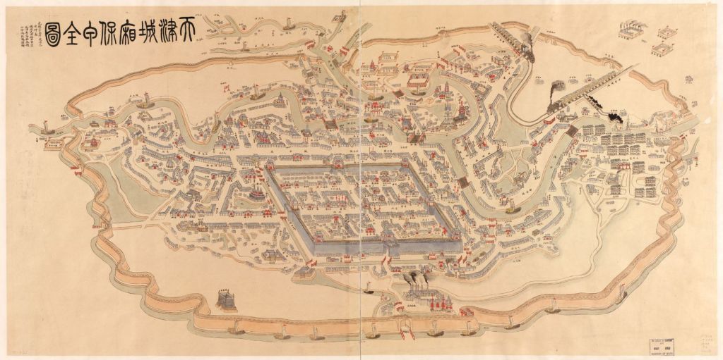 À partir du milieu du XIXe siècle, l’Asie devient le centre de gravité des empires européens. Au Japon, le Yokohama Grand Hotel, inauguré en 1870 devient l’emblème architectural de l’occidentalisation des grands ports ouverts et le chemin de fer un symbole d’appropriation de la modernité. En Chine, les concessions étrangères constituent des foyers actifs d’interaction entre Chinois et étrangers, sous l’impulsion des élites modernisatrices chinoises. Des lieux qui deviennent également des havres de paix pour militants révolutionnaires ou seigneurs de la guerre en rupture de ban. Capitale diplomatique de la Chine, deuxième pôle économique du pays et deuxième centre politique et intellectuel après Pékin, Tianjin constitue une vitrine de la modernité urbaine chinoise des années 1870-1900 : gare, télégraphe, hôtel international, système postal public, industrie d’armement, université. Elle illustre la réalité d’une mondialisation impériale en Chine, d’autant plus intense qu’elle est limitée à Tianjin. Cette modernisation fait-elle pour autant consensus ? La carte de Tianjin réalisée par Feng Qihuang surreprésente les édifices du pouvoir impérial et rétrécit le territoire sous domination étrangère. Un symbole du dynamisme de la cartographie traditionnelles qui peut également se comprendre comme une résistance aux normes culturelles occidentales souhaitées par le pouvoir impérial.