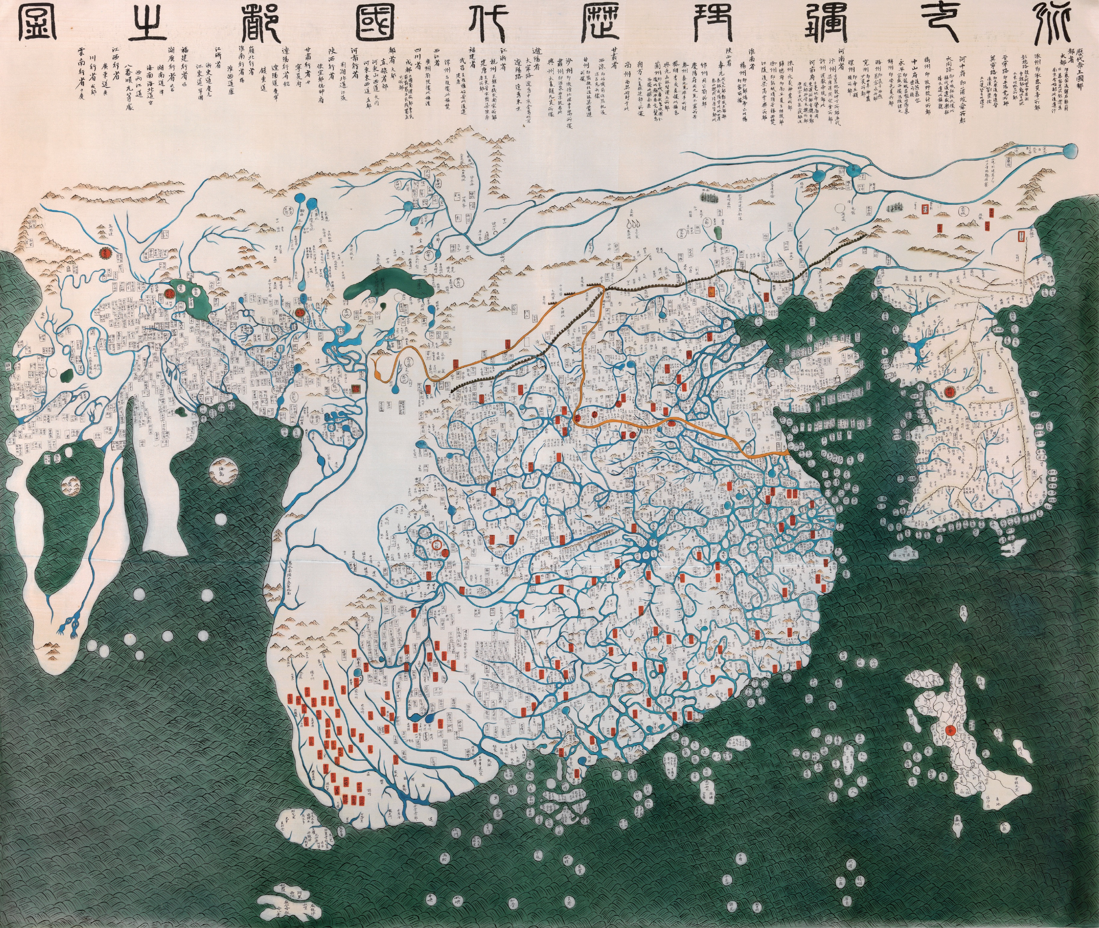 À la différence des représentations européennes, les cartes asiatiques sont conçues comme de véritables œuvres d’art et porteuses d’un imaginaire n’hésitant pas à associer des territoires profanes aux espaces sacrés, à faire figurer des phénomènes naturels et spirituels, voire des mondes qui n’existent pas. Le rêve de Jâhangîr est marqué par une vision de l’univers mêlant les hommes et le divin. En Corée, les atlas Chonhado représentent une carte du monde sous les cieux incluant également des lieux mythiques cités dans les classiques de la littérature chinoise. Des œuvres, comme la carte de Yu, comprennent des provinces, montagnes ou fleuves empruntés aussi bien au présent qu’au passé. Au-delà de la réalité topographique, s’exprime une vision du monde au sein de laquelle le cartographe n’est pas extérieur au territoire qu’il décrit. Dans la tradition cartographique chinoise, vietnamienne et japonaise, la mise en scène des territoires intègre des pratiques sociales : représentation de déambulation de pèlerins, de souverains ou des cartographes eux-mêmes.