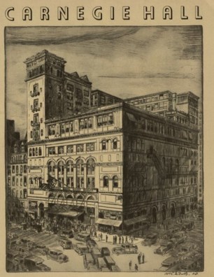 Dessin datant de 1936 représentant le Carnegie Hall, salle de concert new yorkaise, construite et financée par le milliardaire Andrew Carnegie, à la fin des années 1890, avec pour objectif de valoriser son action philanthropique.