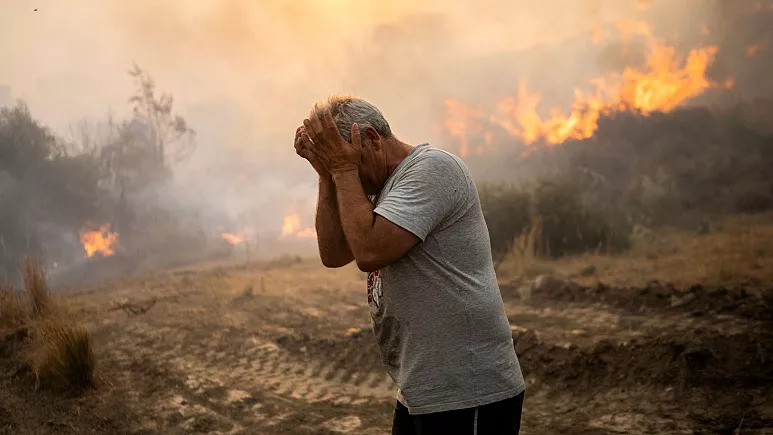 Incendies dans le village de Gennadi, sur l’île de Rhodes en mer Égée au sud-est de la Grèce, le 25 juillet 2023 – crédit photo : Angelos Tzortzinis/AFP