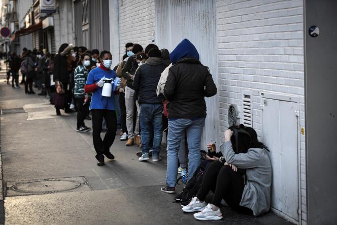 File d’attente dans le cadre d’une opération de distribution alimentaire menée par l’association Linkee, à Paris le 9 mars 2021. Crédit photo : Stéphane de Sakutin / AFP