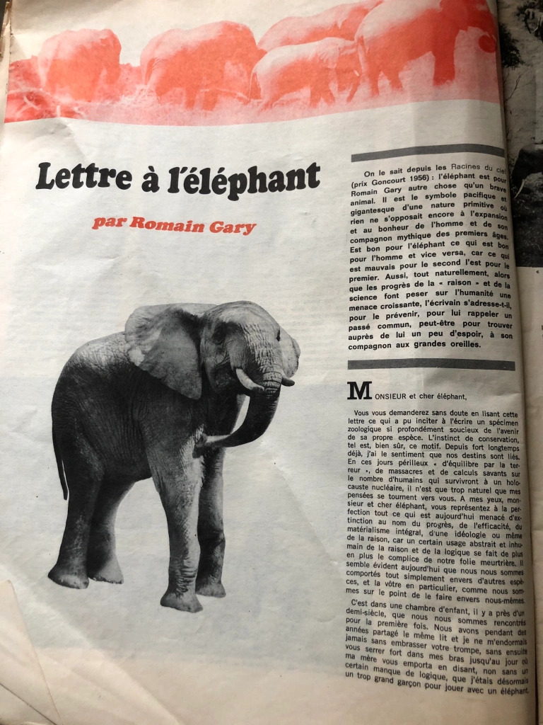 Parmi les singularités qui caractérisent Romain Gary, celle d’avoir été précurseur de la question écologique, et plus précisément de la protection de la faune occupe une bonne place. Point d’orgue de cette prémonition salvatrice ? L’un de ses romans les plus aboutis, « Les Racines du ciel », paru en 1956, et qui obtient un prix Goncourt la même année. À l’intérieur de celui-ci, une place centrale est donnée aux éléphants que défend la valeureux Morel avec une passion grandiose. Ils sont l’objet de descriptions magnifiques, bien entendu, mais aussi l’occasion de réflexions sur la vie des hommes, parfois acerbes, tranchantes, mais également touchantes…