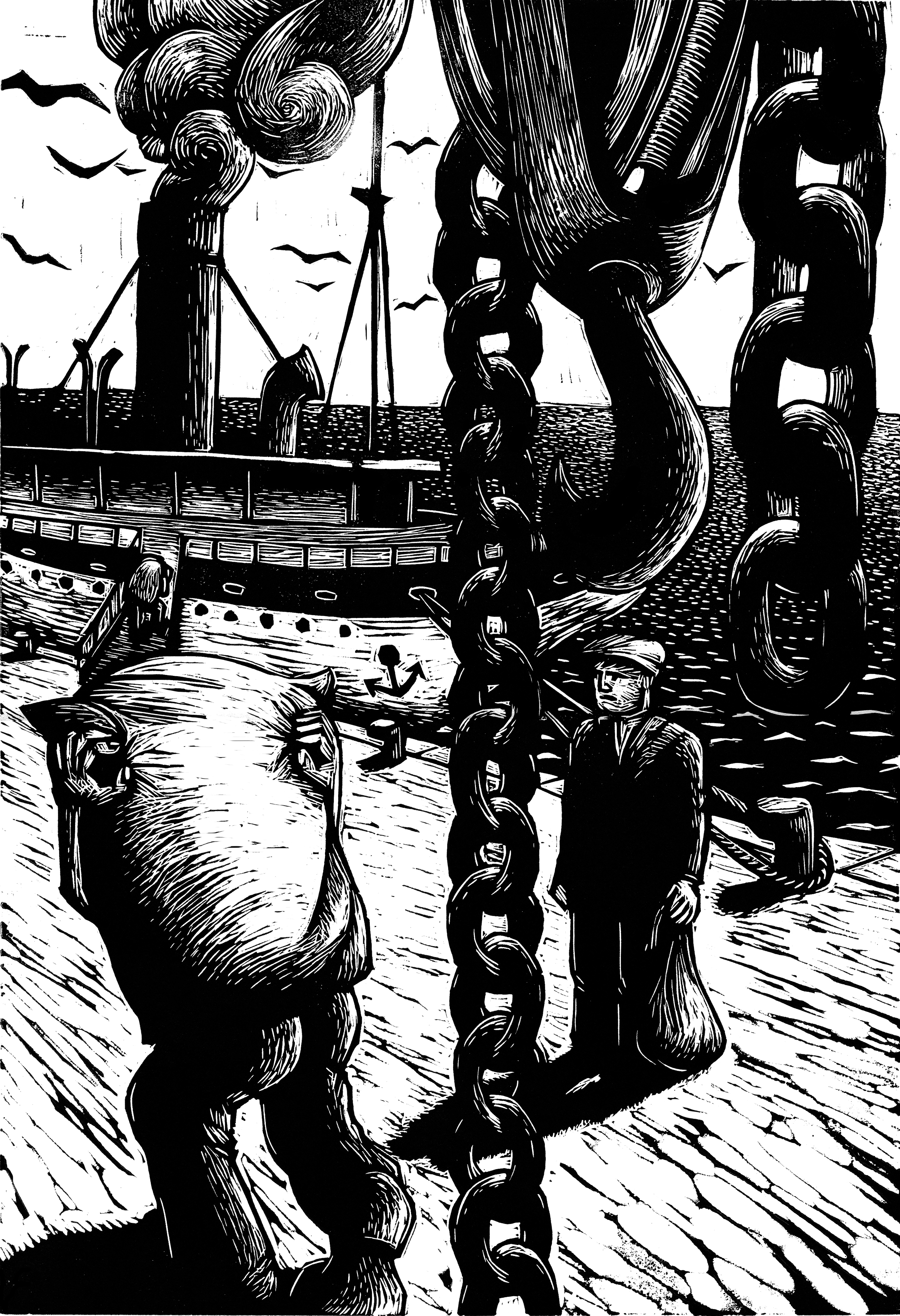 En outre, j’ai essayé de mettre du son dans mes gravures, de faire en sorte que chaque image, même si elle est muette du point de vue du texte, ne soit pas silencieuse. Pour chaque image de mon roman, il est possible de se représenter et d’entendre le son de la scène. Il faut se prêter à l’exercice et essayer d’entendre, pour chaque image, le son qu’elle produit. Est-ce que la cloche sonne ? est-ce qu’on entend le bruit de la foule, des pas, des cris, des chaines qui s’entrechoquent, des oiseaux au loin, des machines, les sabots des chevaux ?