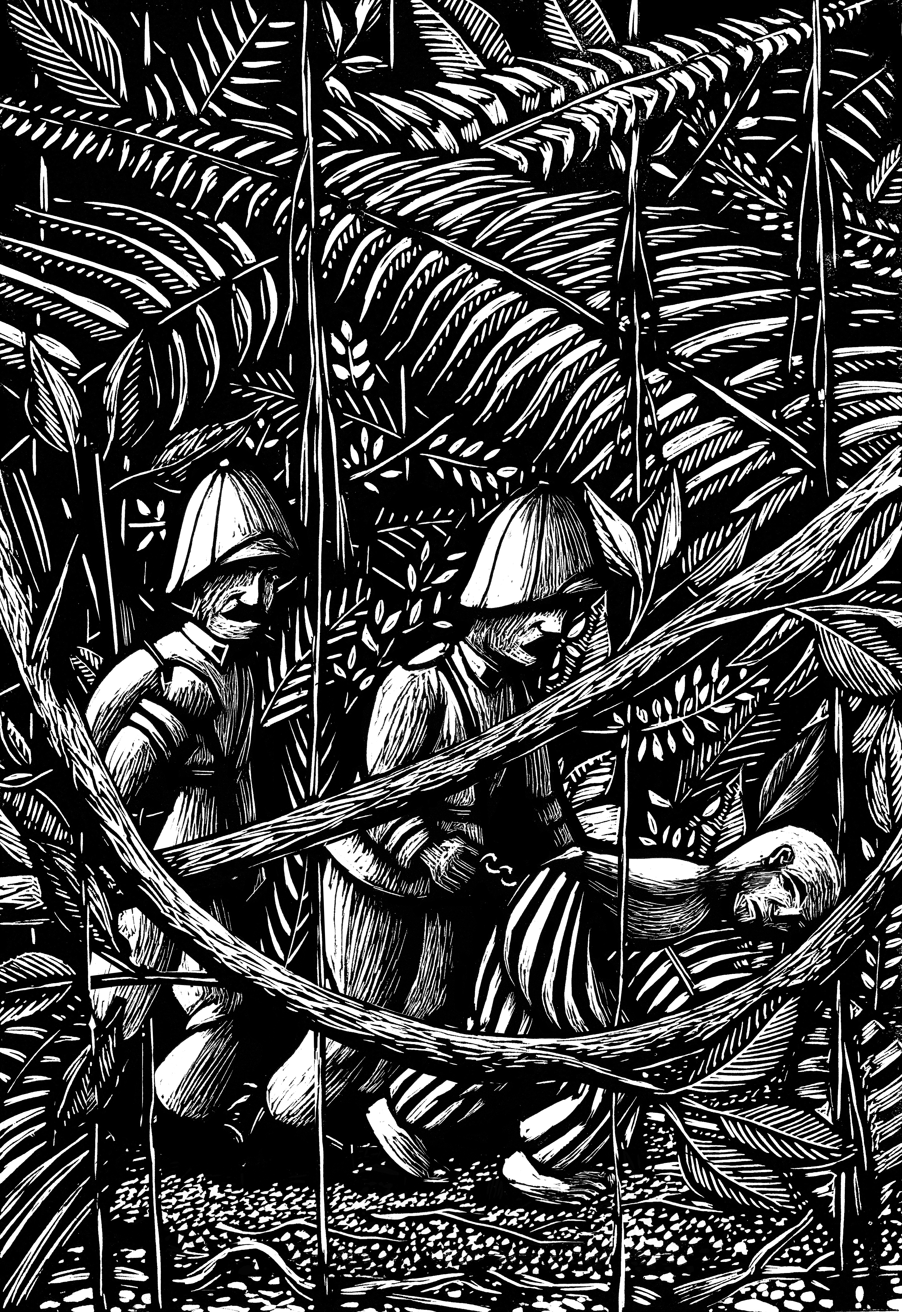 Dans une vie antérieure, j’étais photographe, pratiquant essentiellement le noir et blanc. Le point commun avec la gravure en taille d’épargne, c’est que l’image que l’on produit en gravant la matrice, en l’occurrence ici du linoléum, est en négatif. La photographie que j’ai pratiquée dans les années 1980/90 m’a appris à porter mon attention sur la position des corps, sur la diversité des lumières et des valeurs de gris, sur l’importance du cadrage, des valeurs de plans, du rapport entre les personnages et le décor.