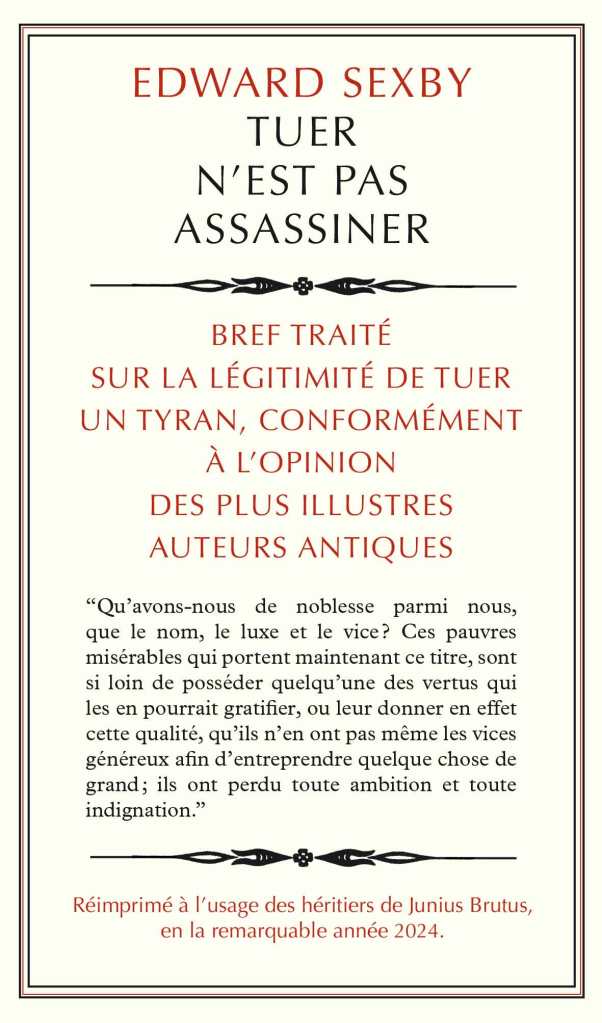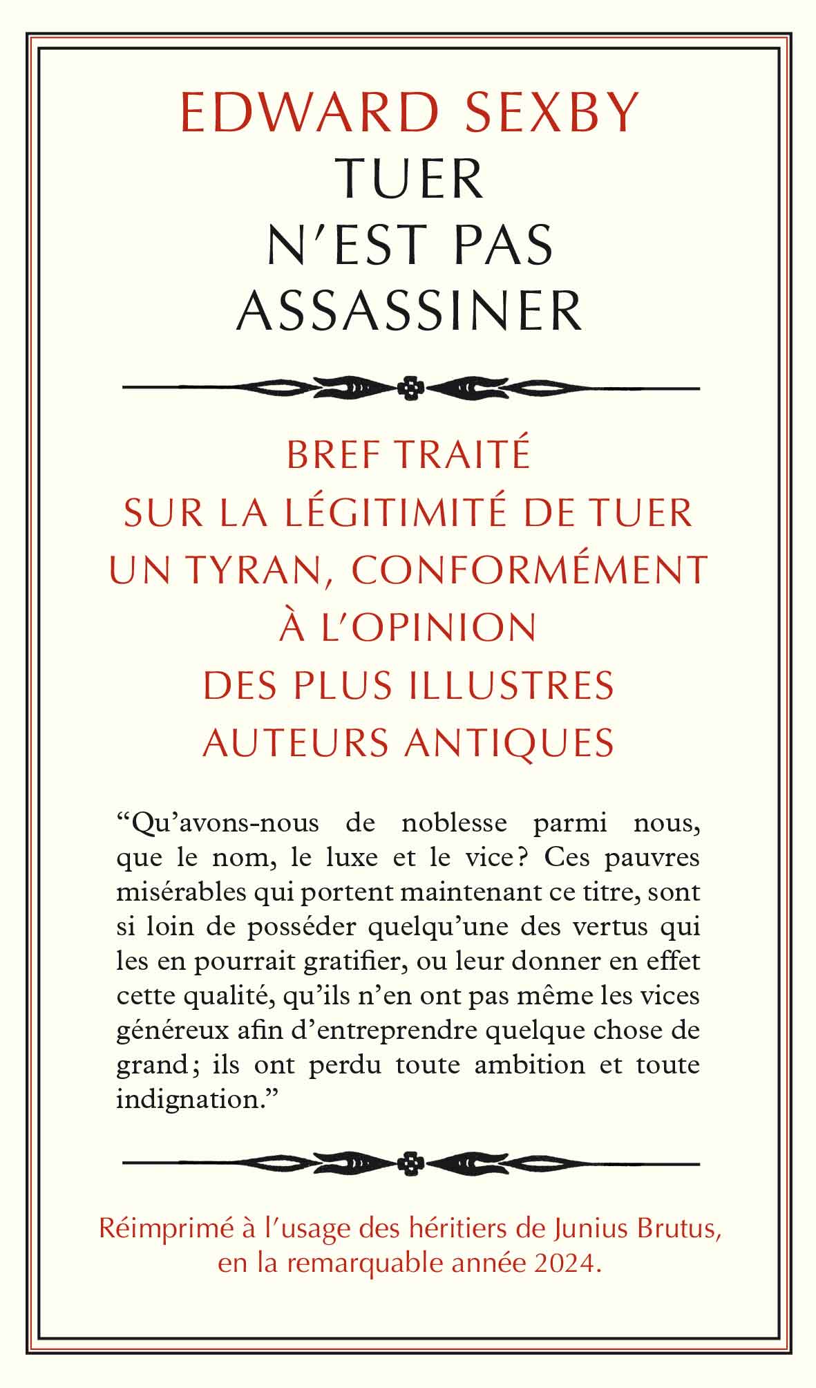 C’est dans ce contexte que paraît en 1657 un pamphlet attribué à Edward Sexby (publié sous le pseudonyme de William Allen, sa paternité reste incertaine), et appelant à éliminer Cromwell. Loin d’être un simple libelle, un appel au meurtre gratuit, ou d’être uniquement dirigé contre le tyran anglais, l’opuscule vise à démontrer l’existence d’un droit général et universel à la légitime défense pour les peuples opprimés.