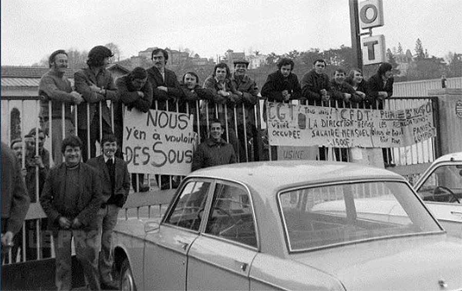 Grève aux usines Peugeot de Saint-Étienne pour protester contre le tabassage d’un syndicaliste par un commando patronal, le 12 avril 1973. La grève sera maté, suivant les mêmes méthodes