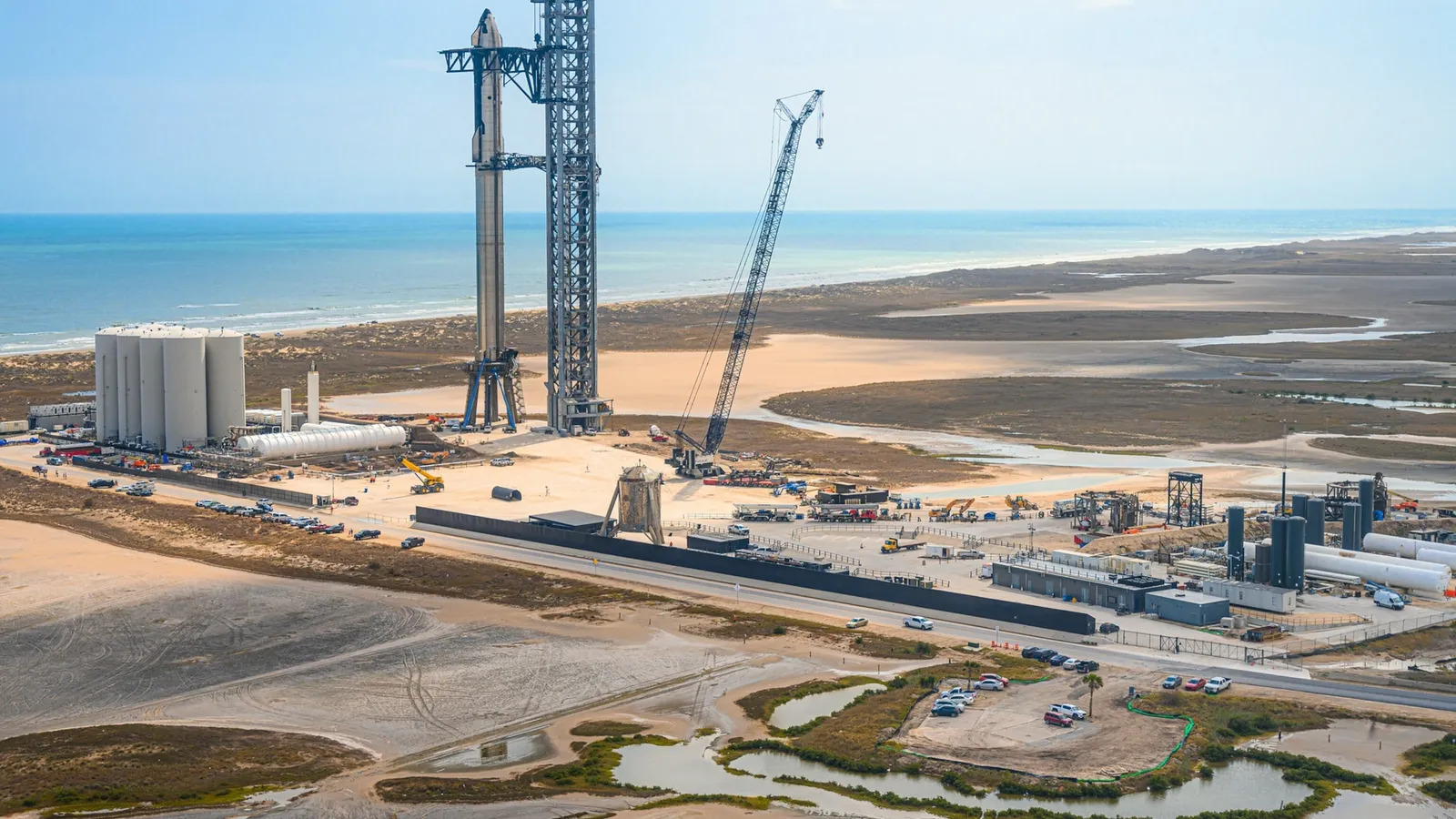 Le Starship SN20 et le booster Super Heavy 4 sont empilés sur la base de SpaceX à Boca Chica Beach, au Texas.